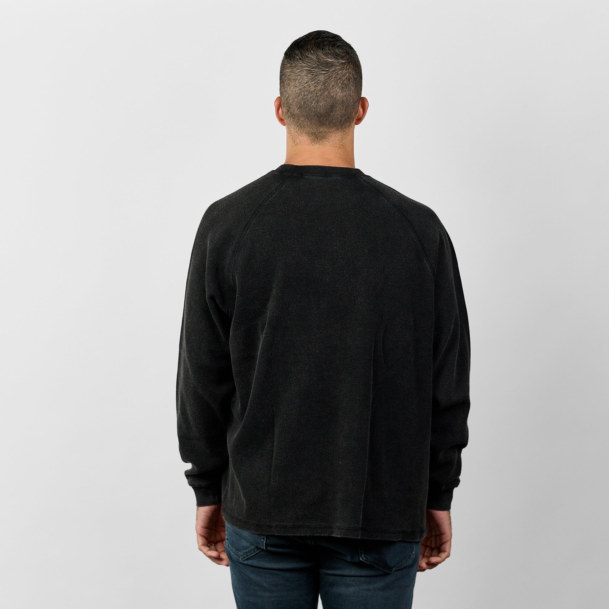 Vintage-inspired and comfortably modern, the Nashville Waffle Raglan Long Sleeve in Black features a relaxed fit and mineral-washed texture for a lived-in look.
