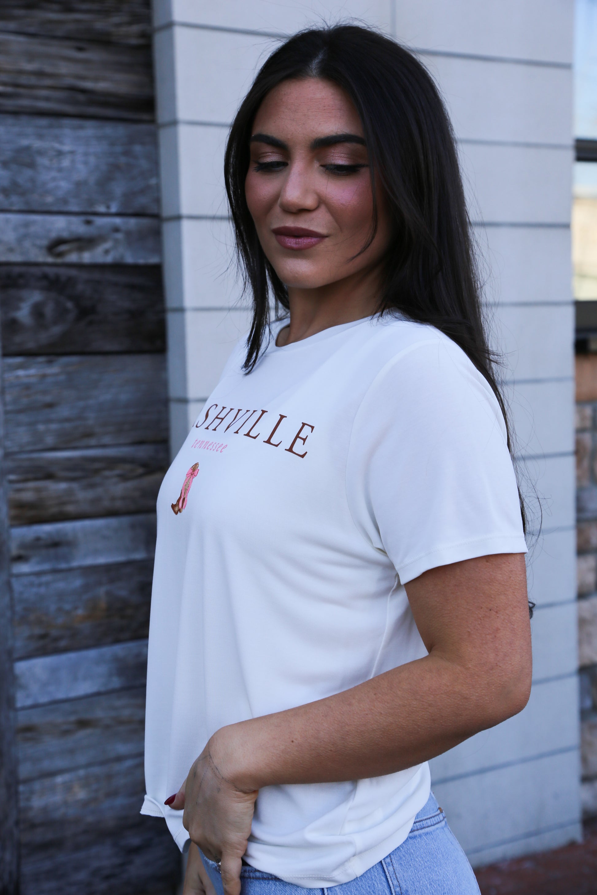 Soft touch white tee with Nashville + pink boot graphic. Easy to wear, easy to love, just like the city it reps!